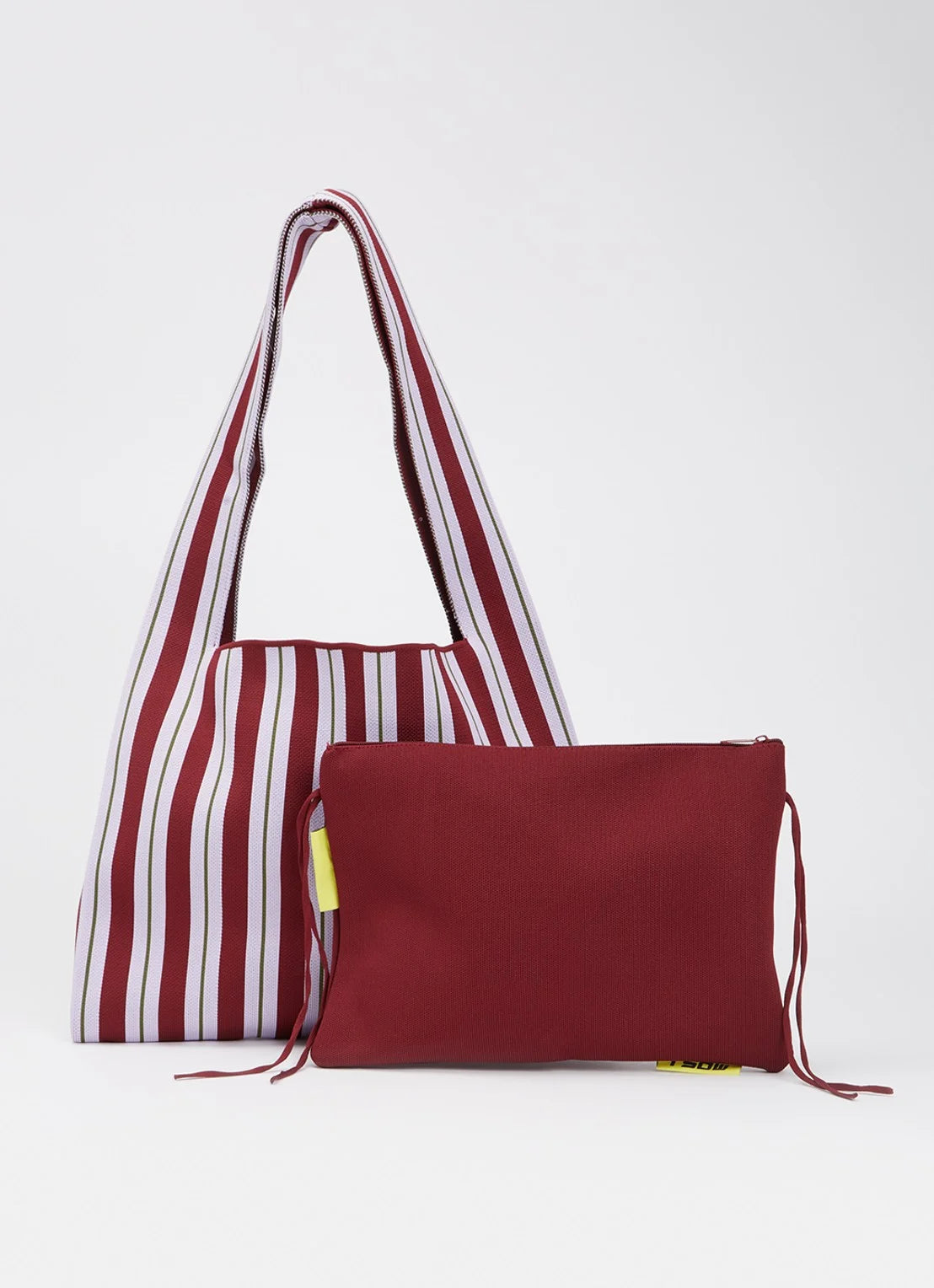 A striped crossbody bag in burgundy, purple and green, designed to carry your essentials with a 14-inch inner bag included.