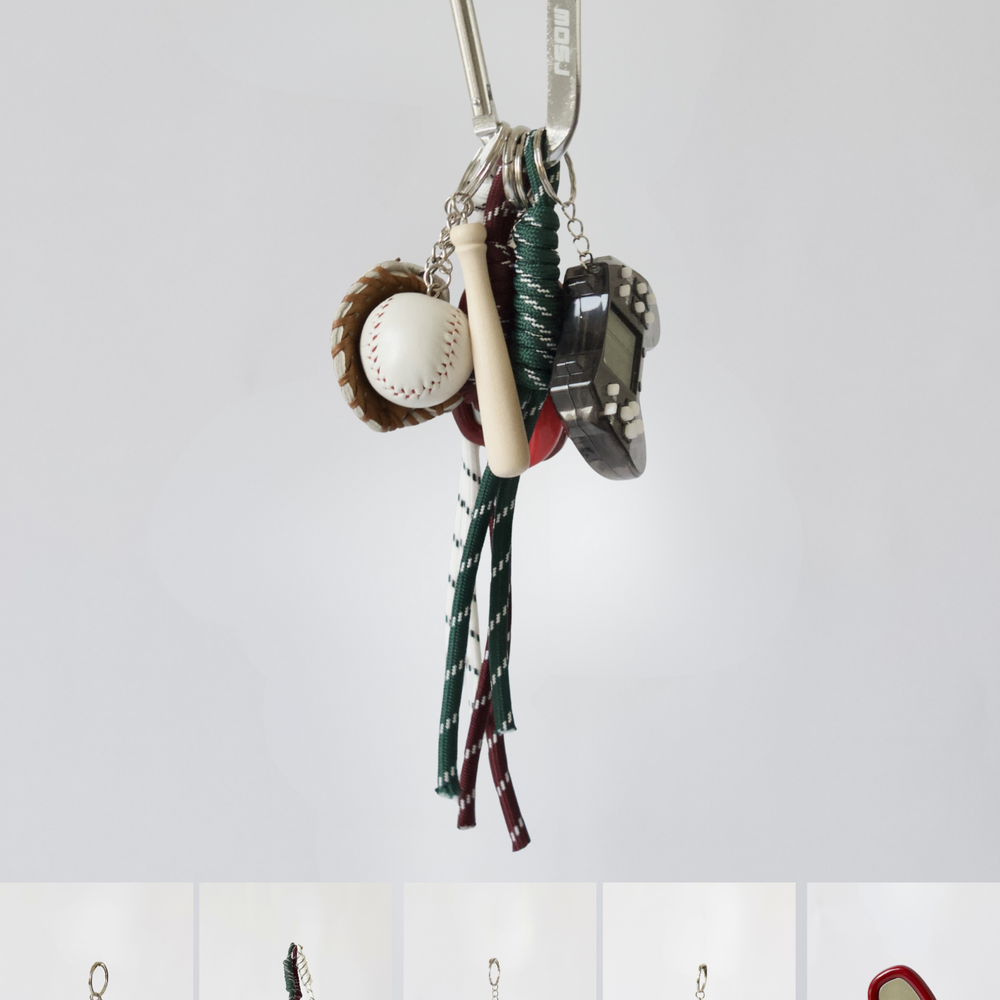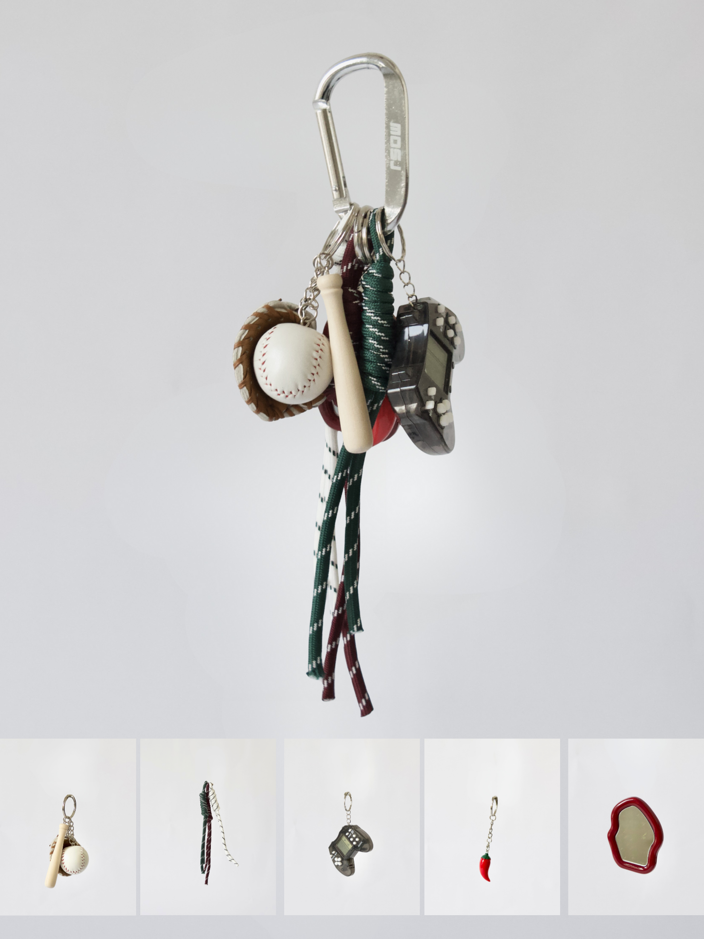 The perfect finishing touch for your bag or outfit. The RIOJA bag charm consists of the iconic "MOSJ" buckle, three colored ropes (white, brown, dark green), the "Baseball", "Gameboy" and the "pepper" charms.